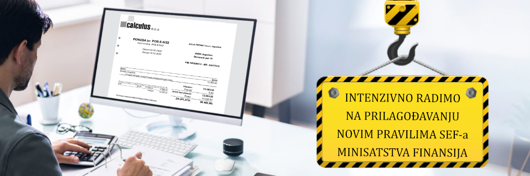 U Calculusu d.o.o. je u toku intenzivno prilagođavanje novim pravilima SEF-a Ministarstva finansija, objavljenim 11.04.22 i 19.04.22, novim pravilima servisa Moj-eRačun, kao i integracija sa servisom Kancelarko. Nova verzija prilagođena SEF-u i servisu Moj-eRačun se očekuje u subotu 23. aprila 2022. godine, a verzija za servis Kancelarko u prvoj polovini maja.
